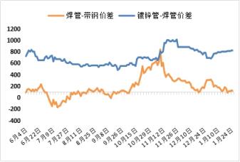 焊镀管厂综合生产利润压缩。1月结算周期内焊管厂平均盈利收窄至30元,螺旋管、架子管受季节性影响更甚;镀锌管由于原料锌锭价格震荡偏高,而月上旬管厂为促进贸易商冬储拿货,采取涨价不涨的保价原则,上下受压;月中下旬冬储政策落地,折算含税出厂价格5400-5600元,实质利润空间同样受限。