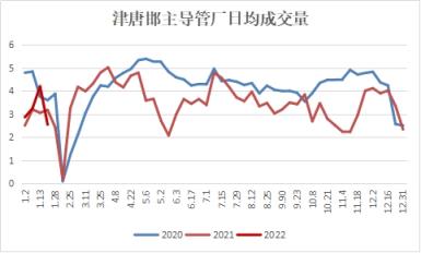 从焊镀管品种来看,1月在统计11家管厂日均出货量3.33万吨,高于上年冬储同期11.11%,低于2020年10.96%。1月主导管厂通过现价优惠、预付款及协议超量优惠、远期保价政策等提高中大协议户冬储操作的积极性,随着盘面情绪由谨慎转向偏积极,各地贸易商今年储货量在正常库存的10%-20%之间。中央经济工作会议将管道建设工作提升到新高度,针对“城市血管”作出专门批示,未来利好老旧小区改造、水利、能源输送用管。