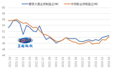 另据摩根大通数据显示,2024年3月份,摩根大通全球制造业PMI指数为50.6%,较上月回升0.3个百分点;其中,产出指数、新订单指数在扩张区间继续回升,其中,产出指数较上月回升0.7个百分点,至51.9%;新订单指数较上月回升0.5个百分点,至50.9%。2024年3月份监测的20个全球主要国家和地区制造业PMI指数中有10个国家制造业PMI处于50%以上,与上月持平;有11个国家及地区制造业PMI指数较上月有所回升,占比达55%,较上月下滑15个百分点,反映全球制造业恢复态势有所分化。