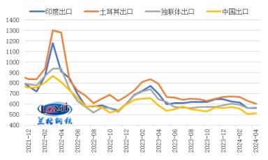 目前我国厚壁钢管出口报价优势仍存。研究中心监测数据显示,截至2024年4月11日,印度、土耳其、独联体热轧卷板出口报价(FOB)分别为560美元/吨、605美元/吨和565美元/吨,中国热轧卷板出口报价(FOB)为515美元/吨;目前我国热卷出口报价分别较印度、土耳其、独联体热卷出口报价低45美元/吨、90美元/吨和50美元/吨(详见图4)。