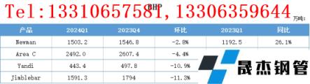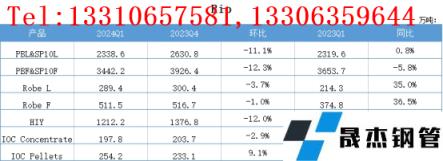 PBL&SP10L第一季度产量2338.6万吨,环比下降11.1%,同比上升0.8%;PBF&SP10F第一季度产量3442.2万吨,环比下降12.3%,同比下降5.8%;Robe L第一季度产量289.4万吨,环比下降3.7%,同比上升35.0%;Robe F第一季度产量511.5万吨,环比下降1.0%,同比上升36.5%;HIY第一季度产量1212.2万吨,环比下降12.0%,同比下降11.3%;IOC Concentrate第一季度产量197.8万吨,环比下降2.9%,同比下降6.4%;IOC Pellets第一季度产量254.2万吨,环比上升9.1%,同比上升16.1%。