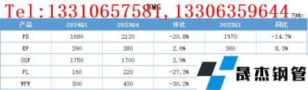 FB第一季度产量1680吨,环比下降20.8%,同比下降14.7%;KF第一季度产量390吨,环比上升2.6%,同比上升8.3%;SSF第一季度产量1750吨,环比上升2.9%,同比上升6.7%;FL第一季度产量160吨,环比下降27.3%,同比下降27.3%;WPF第一季度产量300吨,环比下降30.2%,同比下降31.8%.
