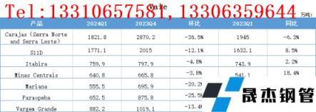 Carajas(Serra Norte and Serra Leste)第一季度产量1821.8吨,环比下降36.5%,同比下降6.3%;S11D第一季度产量1771.1吨,环比下降12.1%,同比上升8.5%;Itabira第一季度产量759.9吨,环比下降4.8%,同比上升2.2%;Minas Centrais第一季度产量640.8吨,环比下降3.8%,同比上升18.4%;Mariana第一季度产量555.5吨,环比下降20.2%,同比下降3.4%;Paraopeba第一季度产量652.5吨,环比下降25.5%,同比上升50.8%;Vargem Grande第一季度产量882.2吨,环比下降13.4%,同比上升9.3%。