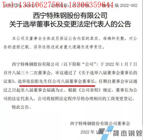 张伯影先生:1970年7月出生,汉族,中共党员,中国国籍,河北人,大专学历,工程师,历任西宁特殊钢股份有限公司炼钢分厂一炼作业区作业长、炼钢分厂厂长、炼轧分厂厂长、转炉分厂厂长、三炼分厂厂长、锻钢分厂厂长、资源事业部部长、西宁特殊钢股份有限公司副总经理、总经理及董事、青海西钢新材料有限公司董事长,拟任西宁特殊钢股份有限公司董事。