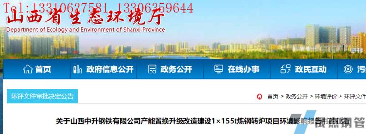你公司《关于<山西中升钢铁有限公司产能置换升级改造建设1×155t炼钢转炉项目环境影响报告书>报批的申请》(中升申字〔2021〕72号)、省生态环境保护服务中心《关于山西中升钢铁有限公司产能置换升级改造建设1×155t炼钢转炉项目环境影响报告书的评估报告》(晋环服务评估函〔2021〕151号)及相关材料收悉。经研究,现批复如下: