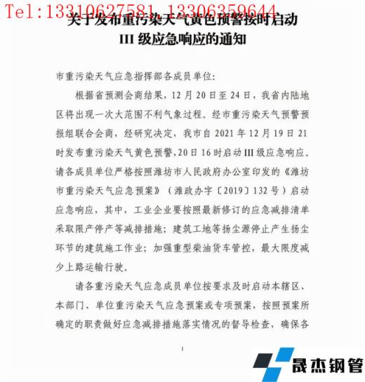 根据省环境应急与重污染天气预警中心与中国环境监测总站、省环境气象中心联合会商,预计12月20日起,高空转为脊区控制,地面湿度逐渐升高,风力较弱,扩散条件转差,受逆温、风场辐合等不利气象条件影响,我市可能出现一次以PM2.5为主的中度至重度污染天气过程。按上级要求,经市人民政府批准,现向全市发布重污染天气橙色预警,定于2021年12月19日12时启动Ⅱ级应急响应,解除时间另行通知。具体减排措施如下: