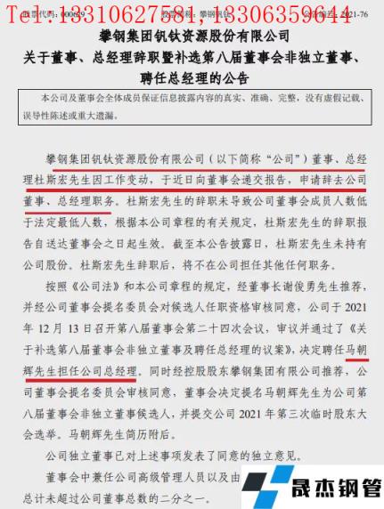 12月13日,攀钢钒钛董事会收到公司董事、总经理杜斯宏因工作变动,于近日向董事会递交报告,申请辞去公司董事、总经理职务。杜斯宏的辞职未导致公司董事会成员人数低于法定最低人数,根据本公司章程的有关规定,杜斯宏的辞职报告自送达董事会之日起生效。截至本公告披露日,杜斯宏未持有公司股份。杜斯宏辞职后,将不在公司担任其他任何职务。