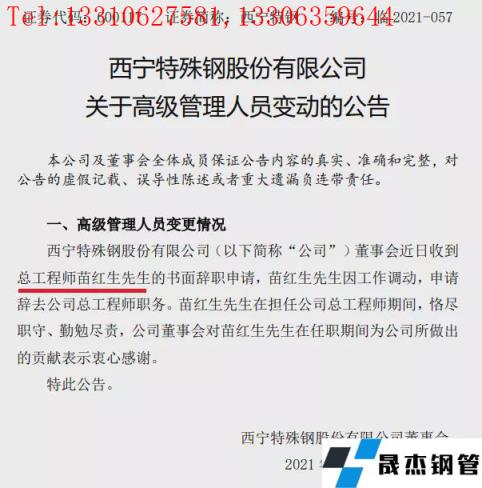2021年12月10日,西宁特钢发布公告,公司人事变动:董事长尹良求、总工苗红生辞职!张伯影拟任董事!
