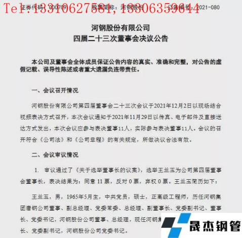 12月3日河钢股份有限公司(以下简称河钢股份)发布了第四届二十三次董事会决议公告,据该公告显示,河钢股份第四届董事会二十三次会议于2021年12月2日以现场结合视频表决方式召开,会议审议并通过了《关于选举董事长的议案》,选举王兰玉为公司第四届董事会董事长。
