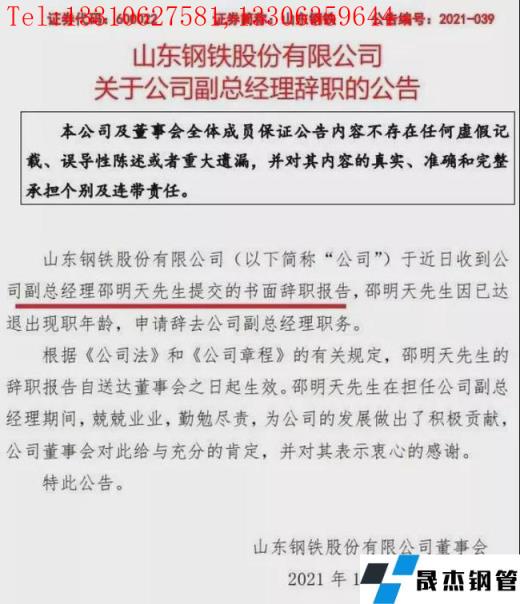 12月1日,山东钢铁发布公告称,于近日收到公司副总经理邵明天先生提交的书面辞职报告。邵明天先生因已达退出现职年龄,申请辞去公司副总经理职务。