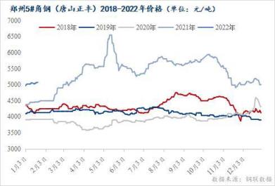 从近五年价格来看,2021年整体价格较往年明显抬升,以郑州5#角钢(唐山正丰)为例,2021年均价较2020同期上升36.96%,最高点为五月份6550元/吨,比2020年十二月份峰值高1950元/吨。进入本月,河南地区型钢价格小幅上涨,1月份虽然河南多地疫情频发,交通运输管控加严,下游采购进度受限,整体需求表现不佳,但受到原材料铁矿及环保政策等因素的影响,价格趋强运行。截止目前,河南疫情得以有效控制,考虑到春节假期过后,下游逐步复工,需求好转,预计市场价格有一定上涨空间。