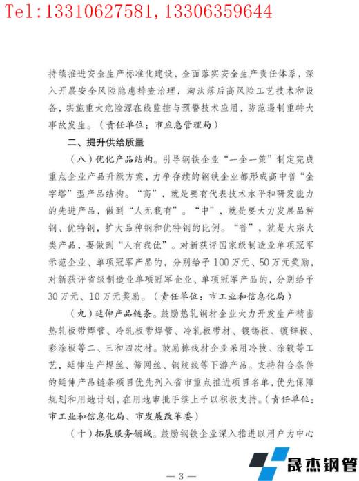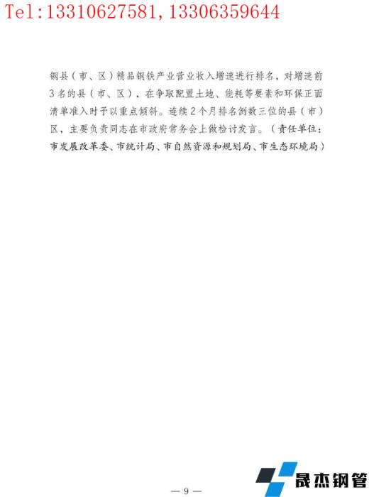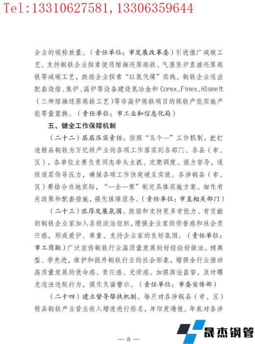 按照"五个一"工作机制,把打造精品钢铁为万亿级产业的各项工作落实到各部门、各县(市、区),结合当地实际,"一企一策"制定具体实施方案。鼓励和支持更多有能力、有贡献的钢铁企业家加入各级政治组织,广泛宣传钢铁行业高质量发展的好经验好做法,维护和提升钢铁行业的社会形象。加强舆论监督,及时曝光违法违规行为。建立督导帮扶机制。每月、年底对各涉钢县(市、区)精品钢铁产业营业收入增速进行排名,对增速前3名的县(市、区),在争取配置土地、能耗等要素和环保正面清单准入时予以重点倾斜。