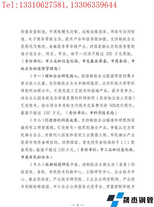 鼓励钢铁企业深入推进以用户为中心的服务型制造,开展规模化定制、远程运维服务、网络化协同制造、电子商务等新业态,提升产品和服务附加值。支持钢铁企业发展现代物流、金融服务等非钢产业。对国家新认定的服务型制造示范企业、项目、平台,给予一次性不超过200万元奖励。