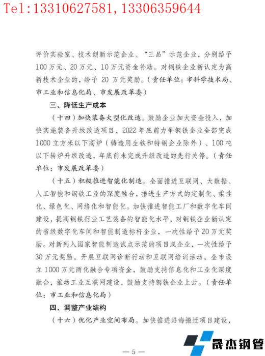 鼓励企业加大资金投入,加快实施装备升级改造项目,2022年底前力争钢铁企业全部完成1000立方米以下高炉(铸造用生铁和特钢企业除外)、100吨以下转炉升级改造,年底前未完成升级改造的先行关停。