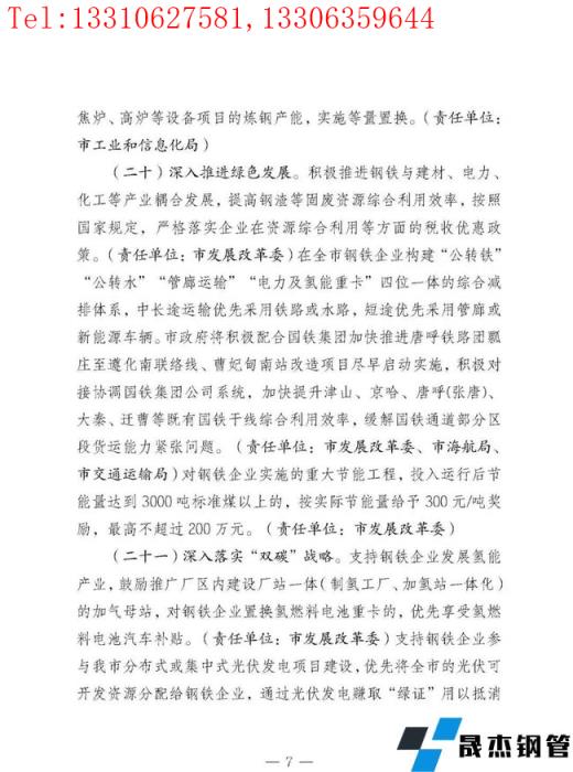 积极推进钢铁与建材、电力、化工等产业耦合发展,提高钢渣等固废资源综合利用效率,按照国家规定,严格落实企业在资源综合利用等方面的税收优惠政策。在全市钢铁企业构建"公转铁""公转水""管廊运输""电力及氢能重卡"四位一体的综合减排体系,中长途运输优先采用铁路或水路,短途优先采用管廊或新能源车辆。对钢铁企业实施的重大节能工程,投入运行后节能量达到3000吨标准煤以上的,按实际节能量给予300元/吨奖励,最高不超过200万元。