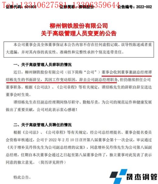 2月10日,柳州钢铁股份有限公司发布关于高级管理人员变更的公告。公告显示,柳钢股份董事会收到董事兼副总经理谭绍栋的书面辞呈,其因工作变动原因,辞去柳钢股份副总经理职务,但仍继续担任柳钢股份董事职务。