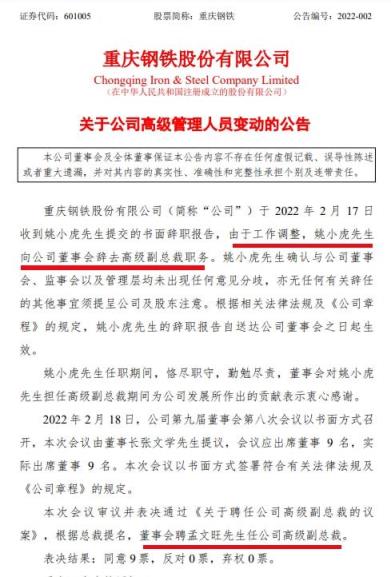 重庆钢铁姚小虎辞职!孟文旺获聘高级副总裁
