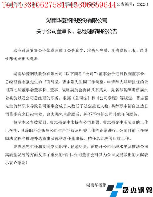 日前,湖南华菱钢铁股份有限公司发布公告称,公司董事会于近日收到董事长、总经理曹志强的书面辞呈。曹志强因工作调整,申请辞去其所担任的公司第七届董事会董事长、董事、战略委员会委员及召集人、提名与薪酬考核委员会委员以及公司总经理的职务。