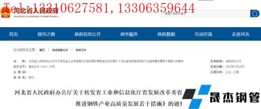 2月28日,河北省人民政府发布《河北省加快推进钢铁产业高质量发展若干措施》(以下简称《措施》)的通知。《措施》旨在深化钢铁行业供给侧结构性改革,加快推进河北省钢铁产业主体装备大型化、品种结构高端化、组织机构集团化、空间布局合理化、生产过程绿色化、经营管理数字化,促进钢铁产业高质量发展,为实现钢铁产业由大到强历史性跨越提供有力支撑。