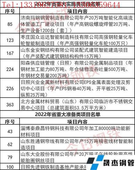 2022年1月20日,山东省人民政府发布《关于下达2022年省重大项目名单的通知》。此次通知中公布的600个项目中,涉及重大实施类项目449项,重大准备类项目151项。其中涉及到日照先进钢铁制造基地产能承接一期项目、济南玛钢厚壁无缝钢管制造有限公司年产20万吨智能化高端流体管道工厂建设项目等10个钢铁相关项目。