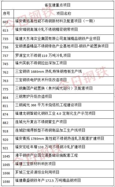 2022年2月25日,福建省发布《2022年重点项目名单》,其中共涉及三钢、宝钢、三宝钢铁、福建龙钢、鼎盛钢铁等多个钢企的二十个钢铁项目!在这20个项目中,仅不锈钢项目就有9个,其中包括宝钢德盛、福安青拓、宝太不锈钢等龙头企业提高产能规模、补齐链条短板的多个项目,而这也彰显了福建以龙头企业为主导,以协作配套项目为依托,推动产业跨区转移集聚和上下游联动,打造千亿不锈钢产业集群的重要规划。