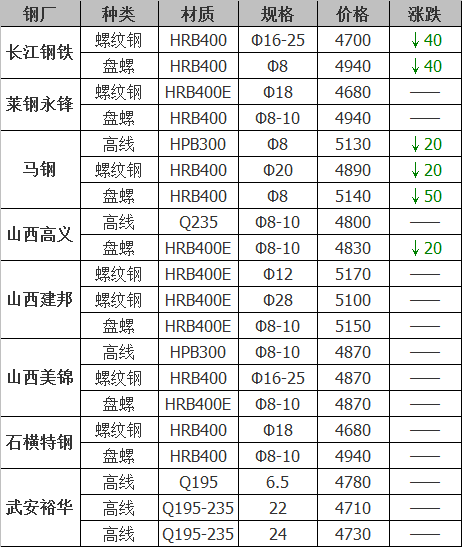 钢厂调价今日建材共9家钢厂调价发布,其中:
