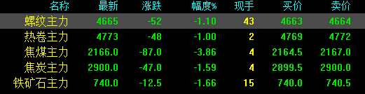 今日螺纹主力期货跌52,收报4665,跌幅1.1%;热卷主力跌48,收报4773,跌幅1%;焦煤主力跌87,收报2166,跌幅3.86%;焦炭主力跌47,收报2900,跌幅1.59%;铁矿石主力跌12.5收报740,跌幅1.66%。