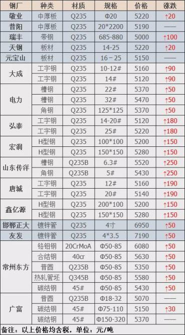 8日秦皇岛安丰执行价上调20,调后:圆钢头、冲豆3820,模具钢、大法兰片、50厚上重型3800,大槽钢、大H型钢、火车大梁3720,无油汽车大梁、汽车弓子3600,2厚马碲铁3600,冷板小料3620,三角矽钢片3620,不含税,单位:元/吨 。