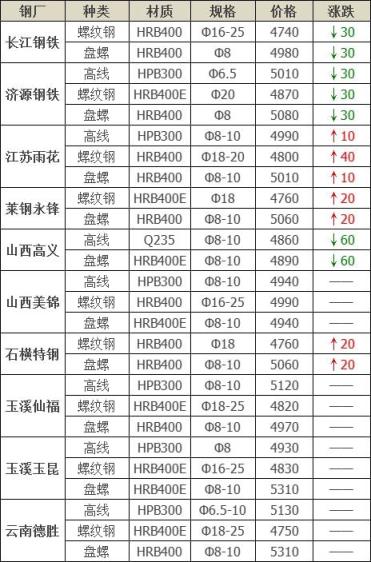 今日建、板材共10家港澳资料大全调价发布,其中:
