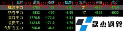 今日螺纹主力期货跌39,收报4753,跌幅0.81%;热卷主力跌103,收报4932,跌幅2.05%;焦煤主力跌172,收报2776.5,跌幅5.83%;焦炭主力跌171,收报3424.5,跌幅4.76%;铁矿石主力跌36.5,收报756,跌幅4.61%。