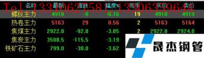 今日螺纹主力期货跌8,收报4918,跌幅0.16%;热卷主力涨29,收报5163,涨幅0.56%;焦煤主力跌92,收报2922,跌3.05%;焦炭主力跌115.5,收报3508.5,跌幅3.19%;铁矿石主力跌30,收报799,跌幅3.62%。