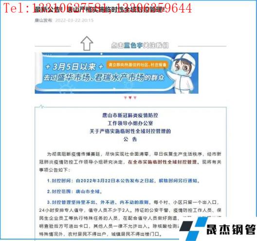 3月22日20时许,唐山发布《关于严格实施临时性全域封控管理的公告》:自本公告发布之日起,唐山市实施临时性全域封控管理。除核酸检测以及应急突发事件等特殊情况外,农村居民不得出户,城镇居民不得出楼门口。