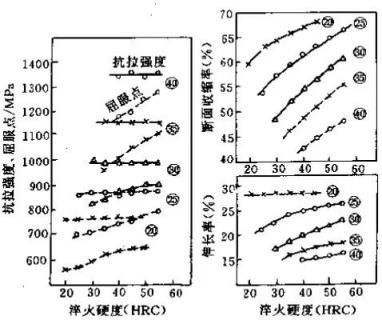 40Cr钢经过830℃加热在不同淬火冷却速度下获得不同层淬火硬度后,通过不同的淬火温度,回火得到不同的回火硬度,然后进行拉伸试验。结果表明,抗拉强度取决于最后回火硬度,几乎不受淬火硬度的影响;而屈服度强度、伸长率和断面收缩率不仅取决于回火硬度,也与淬火硬度有很大关系,在回火得到相同硬度的条件下,这些性能指标随淬火硬度的升高而提高。因此,淬火回火工件不能只控制其回火后的硬度,还应检验淬火后的硬度,以便检查工件淬火是否充分,不充分的淬火,在大多数时候应作为热处理缺陷重新返工处理。