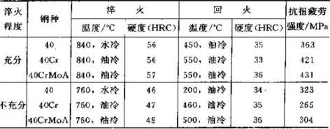 用40钢、40Cr钢和40CrMoA钢加工成两组疲劳试样,第一组式样在840℃正常淬火温度下加热淬火,硬度为56~57HRC,第二组用760℃淬火,淬火不充分,淬火硬度只能达到46~48HRC,将两组式样经过不同温度回火至相同硬度(均为33~36HRC)然后进行疲劳试验,试验结果列于表1.实验表明,淬火不充分的第二组试样的抗扭疲劳强度比充分淬火的第一组试样的抗扭疲劳强度低10.8%~37%。