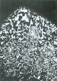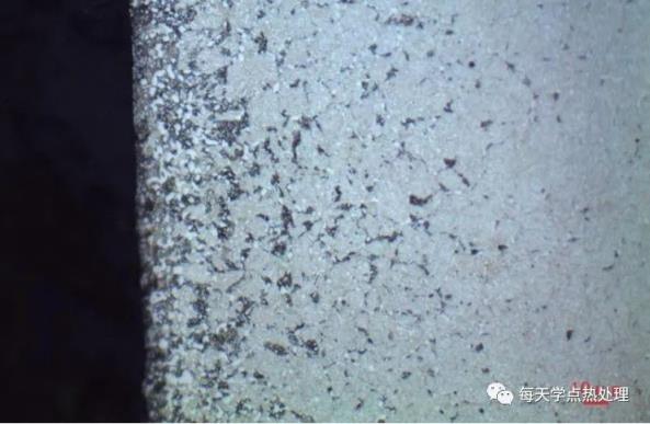 将碳氮共渗中工件的横截面抛光后,在未腐蚀或轻微腐蚀的状态下,使用光学显微镜在表面渗层中有时可观察到一些分散的大小不一的黑色或暗灰色的斑点、黑带和黑网,这些深色的斑点、黑带和黑网,统称为黑色组织。黑色组织的深度一般不超过0.05mm。深色的斑点是一些主要沿奥氏体晶界分布的大小不一的孔洞。黑色带通常出现在距表面0.03mm深度内,黑带的内测往往可观察到黑色网,主要由于表层形成了某些合金元素的碳氧化物、氮氧化物和碳化物等小颗粒,使奥氏体中合金元素贫化,导致淬透性降低而形成了托氏体的结果。碳氮共渗的黑色组织类似于气体渗碳的内氧化,使表面硬度下降,有益的残余压应力减小,或表面形成残余拉应力,导致疲劳强度的降低。20Cr2Ni4A钢碳氮共渗试样表面黑色组织可使弯曲疲劳强度降低约6%。