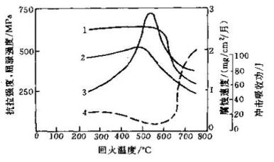 2.2.6脱碳的影响 渗碳工件在缓冷期和重新加热淬火期间,由于温度连续变化,气氛碳势和渗碳工件表面碳的质量分数不可能达到平衡。当气氛碳势低于渗碳表面的碳的质量分数时,渗碳工件表面发生脱碳。脱碳层的显微组织取决于表层的碳的质量分数及淬火冷却速度,当表层仅有轻微脱碳时,有可能降低表层残余奥氏体含量,表层硬度下降很少甚至略有提高;严重的脱碳将使表层出现非马氏体组织,降低表层硬度,使表层呈现残余拉应力状态,使疲劳强度下降。试验表明,0.22mm的脱碳层使Cr-3%Ni钢的弯曲疲劳强度降低40%。当CrMnTi钢的渗碳层由于脱碳使其硬度下降到41~42HRC时,疲劳极限下降50%。三、耐腐蚀性能不良 在腐蚀性环境中工作的零件大多用不锈钢制造。不锈钢是含铬超过5%的铁基合金的总称。但要从真正耐腐蚀的角度看,钢中铬的含量(w)必须超过10%。不锈钢的耐腐蚀性来自于其中的铬,这归因于不锈钢的表面能形成一层称为钝化膜的耐腐蚀的富铬薄膜,由水化铬酸CrxOx(OH)8x-2·nH2O组成。铬的质量分数越高。钝化膜中相对铬含量越多。耐腐蚀性越好。不锈钢按其金相组织分为马氏体不锈钢、铁素体不锈钢、奥氏体不锈钢、铁素体-奥氏体不锈钢和沉淀硬化不锈钢五类,铬在不锈钢中分布不均匀将导致其耐腐蚀性下降,热处理影响铬在不锈钢中的分布,因而热处理也极大的影响不锈钢的耐蚀性。2Cr13型马氏体不锈钢若回火温度选择不当,在450℃~600℃回火时,由于Cr23C6型碳化物沿晶界析出,导致晶界附近局部铬贫化,腐蚀抗力大幅度下降,如图5 所示。▲图5回火温度对2Cr13性不锈钢性能的影响1-抗拉强度2-屈服强度 3-20℃NaCl 3%水溶液中的腐蚀率4-艾氏冲击韧度