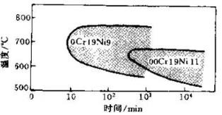 然而在某个特定温度区间和时间参数下进行热处理或在某个温度区间长期使用时,由于含铬碳化物沿晶界析出将导致晶界腐蚀抗力的急剧下降。表示发生晶界腐蚀的热处理温度和时间关系曲线叫做时间-温度-敏化曲线(T-T-S曲线)。图6 就是奥氏体不锈钢的典型T-T-S曲线。在C型曲线的右侧热处理状态下,不锈钢易产生晶间腐蚀。