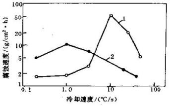 ▲图7冷却速度对1Cr17不锈钢腐蚀速率的影响1-空冷(从1200℃冷却) 2-空冷(从950℃冷却)