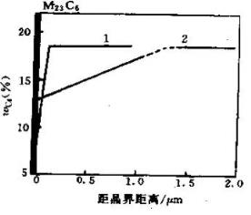 ▲图8铬在晶界碳化物附近的分布1-650℃×2h 2-800℃×2h