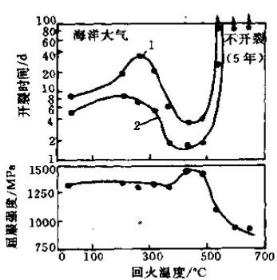 强度强烈地影响马氏体不锈钢的应力腐蚀开裂行为。淬火状态下其应力腐蚀开裂的倾向很大,随着回火温度的升高,应力腐蚀抗力显著得到改善,但是对于Cr12型马氏体不锈钢,在400-550℃温度区间回火时,由于M23C6型碳化物的析出造成基体局部贫铬,会出现应力腐蚀抗力低谷。见图10 。