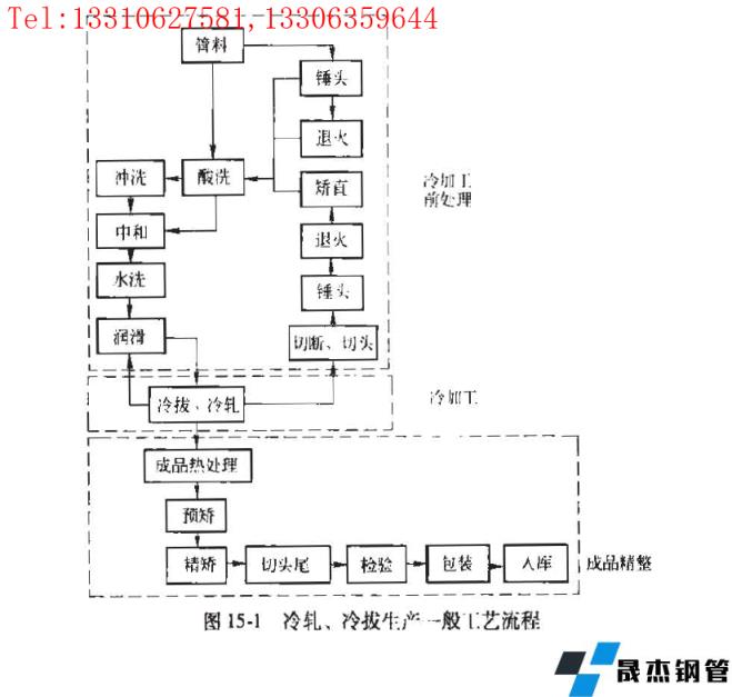 尽管冷加工管的规格范围、尺寸精度、表面质量和组织性能均比热轧优异,但其生产中存在四个方面的问题: 循环次数多、生产周期长、金属消耗大、中间处理过程复杂,图151 是碳钢管和合金钢管的冷轧、冷拔生产的一般工艺流程图。各种钢管由于其材质、技术条件、规格不同,其生产工艺流程及工艺制度也有所不同,但总的来说由下列主要工序组成:
