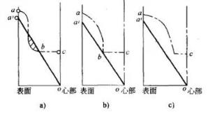 表中数据表明:感应加热淬火半轴的静扭强度高于调质半轴,感应加热淬火层愈深,其静扭强度愈高。数据还表明,40MnB钢中频感应加热淬火可以代替40CrMnMo钢调质半轴。表5 中数据还表明:中频感应加热淬火半轴疲劳寿命比调质半轴提高很多倍,因此半轴调质处理工艺多数已被中频感应加热淬火所取代。(2)半轴感应加热淬火工艺参数的选择:半轴淬硬层深度的确定应以保证半轴内任何一点的扭转应力均小于或等于该点的剪切屈服强度。图3 中点划线表示半轴感应加热淬火后的强度分布情况,a'o表示半轴的扭转应力分布情况。若淬硬层太浅,则半轴强度不足,图3a中b'b区域为危险区;若淬硬层太深,图3c,则由于半轴表层残留压应力降低而降低疲劳寿命。合适的淬硬层深度应如图3b所示。