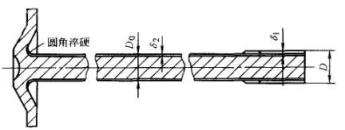 ▲图3半轴工艺淬火硬化层与强度分布a)太浅b)合适c)太深杆部:硬化层深度应达到杆部直径的15%(δ2=15%D0)。法兰根部:要求法兰盘与杆部连接的过渡圆角淬硬。在实际生产中,圆角处硬化区域的最小直径应比半轴杆部直径大25%。这些要求是为了保证半轴的静强度和疲劳强度。花键与杆部的淬硬层深度对静强度影响较大,法兰圆角淬硬对疲劳极限影响较大。每种表面淬火半轴都有最佳的硬化层深,应考虑到硬化层深对表层残留压应力的影响。表6 列出了直径为50mm的带法兰半轴感应加热淬火后花键尾根部位的残留压应力。通常,感应加热淬火硬化层深度可以根据半轴杆部直径的大小和产品设计结构形状来确定。对轻型载重车和小轿车的法兰盘式半轴(杆部直径在50mm以下)淬硬层深度可按下列要求确定(参阅图4)。