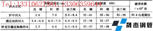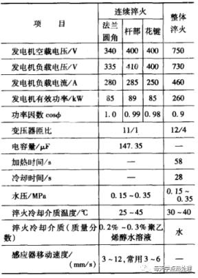 数据表明,感应回火的疲劳寿命较炉中回火为高。其原因是,感应快速加热时,最表层首先瞬时产生马氏体分解,使体积收缩处于相变超塑性阶段,待整体回火完成后表层形成更大的压应力,具有一个更理想的有利于提高疲劳强度的应力分布;而炉内加热缓慢没有这种条件。(3)半轴感应加热表面淬火举例,40MnB钢制造的带法兰半轴的表面淬火工艺技术要求见表8 ,其淬火工艺可以采用连续加热淬火和整体一次加热淬火,工艺参数见表9 和表10 。▼表840MnB钢半轴表面感应淬火技术要求