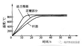 ▲图7采用矩形感应器整体一次感应加热淬火时,半轴表面的均温加热曲线由于在有效圈A端圆弧(见图6) 上镶有硅钢片导磁体,所以法兰根部圆角部位升温较快,加热均温时间长,保证了该处的硬化层深和足够的硬化区域。采用整体一次感应加热淬火还能提高花键齿顶的硬度。采用矩形感应器加热时,由于感应器和零件之间间隙较大(一般为5~8mm),所以升温慢,加热时间长,硬化层厚且均匀。半轴回火也可采用矩形感应器加热,采用15~20℃/s的升温速度,控制感应加热回火温度在(250±10)℃范围内,可以使半轴表面硬度控制在52~63HRC的范围内,性能良好。