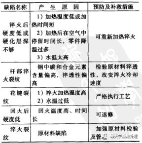5 半轴的常见热处理缺陷及预防补救措施半轴调质的常见热处理缺陷的预防及补救措施见表14。半轴表面感应加热淬火的常见缺陷的预防及补救措施见表15。▼表14半轴调质的常见热处理缺陷的预防及补救措施