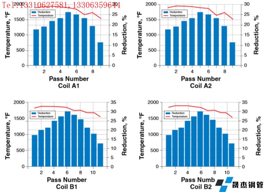 在加热炉经过1.5小时加热到1700℉,图7显示了每道次的压下率和温度,从图可以看出,相同成分的钢卷呈现出相同的温度模式,因此,它们在Steckel轧机出口处的奥氏体晶粒尺寸非常接近。