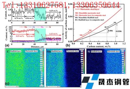 图 2. EMPA 结果关于相邻层(a 和 c)之间合金元素的含量以及使用 Thermal Calc 软件(b)计算的碳活性。