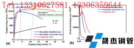图 3.复合钢和参考整体钢的工程应力-应变曲线 (a) 和相应的应变-硬化速率-应变曲线 (b)。注:UD、TD、UTS 和 YS 分别表示均匀延展性、总延展性、极限抗拉强度和屈服强度。
