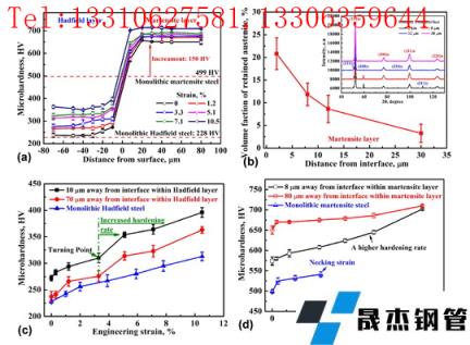 总之,尽管哈德菲尔德层为马氏体贡献了 20% 的碳,但仍保留了它的高应变硬化能力。这一点对于本研究中元素扩散策略的成功具有战略意义。首先,哈德菲尔德层的初始硬化率与整体钢相当。根据元素分布结果(图 2(a)),两层之间存在过渡层(约20μm厚),其厚度根据硬度分布增加到约45μm(图 4)。该结果表明复合钢由哈德菲尔德层、马氏体层和梯度层组成。几项关于梯度结构的有趣研究表明,在细晶粒和粗晶粒之间的界面处产生的应力不相容性可能导致应变梯度,这将通过梯度区域中的几何必要位错 (GND) 来适应 。
